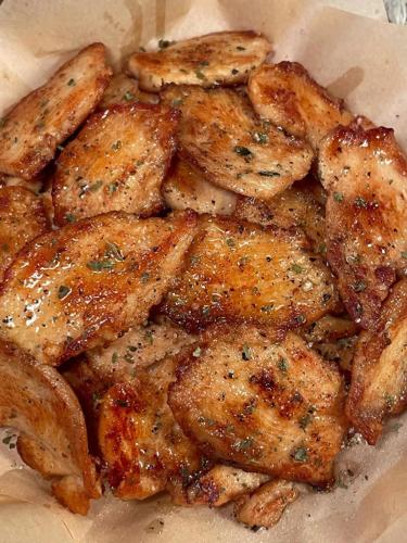 - 下肉不亂動:把雞胸肉一片片鋪進去,保持間距。重點來了!煎1分鐘別翻面!等底部變成金黃色再動,否則容易散架。