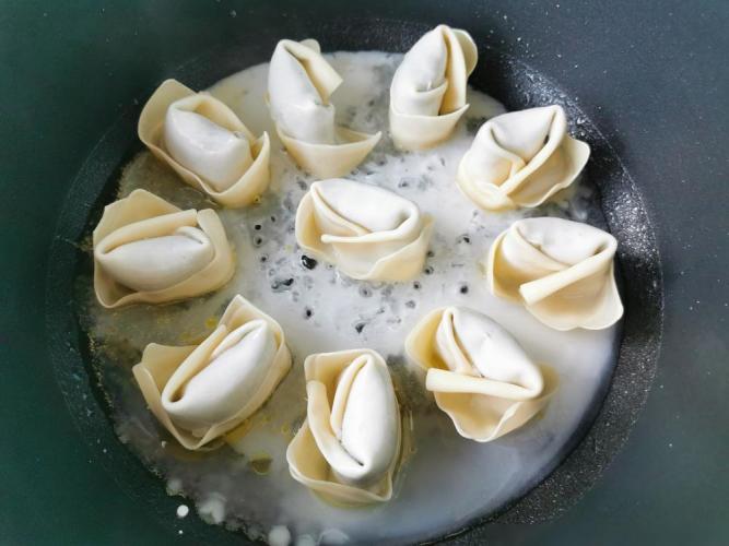 冷凍餛飩直接煎是關鍵——解凍後會出水,導致冰花不均勻;用不粘鍋的話,不用頻繁挪動餛飩,等底部變硬再動;如果怕冰花焦糊,可以先加少量清水燜5分鐘,讓餡兒熟得差不多,再倒澱粉水,這樣冰花會更薄更均勻。